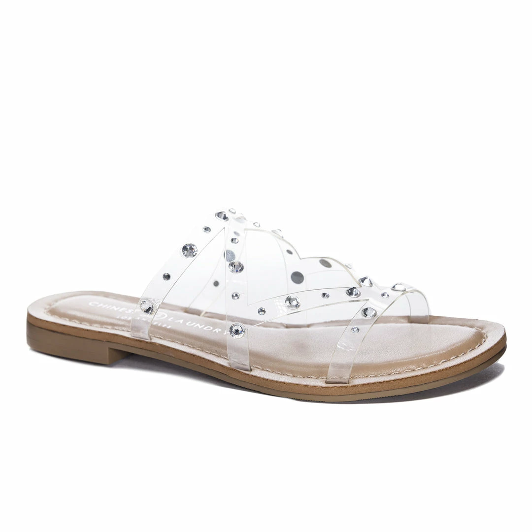 This playful slide sandal with a lightly padded footed features glinting rhinestones on the straps that put some shine in your step.