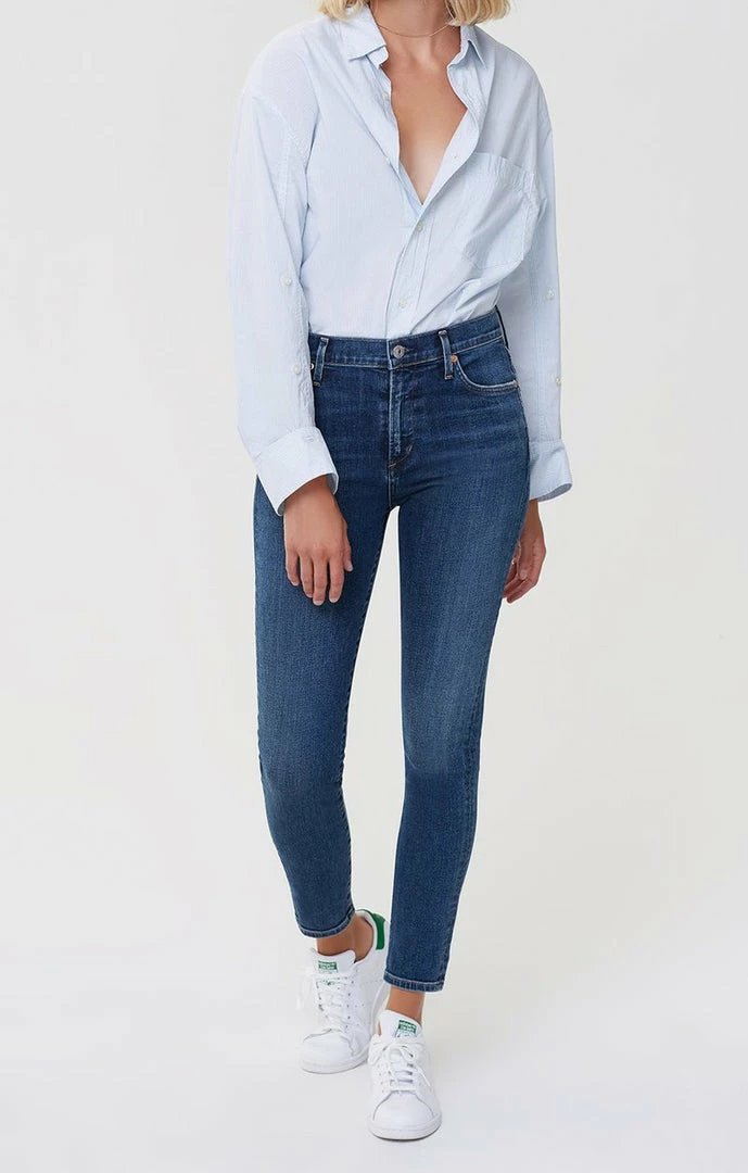Our signature skinny. This iconic mid-rise silhouette is crafted with stretch denim to provide a figure-flattering fit with lasting shape.Â