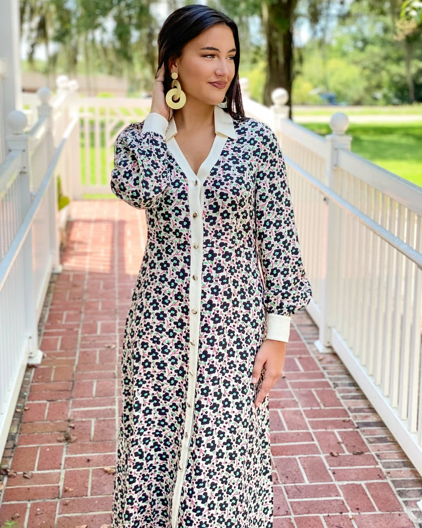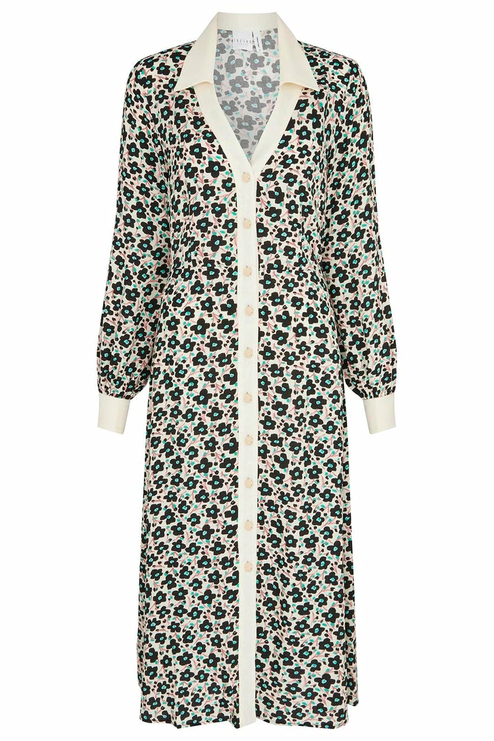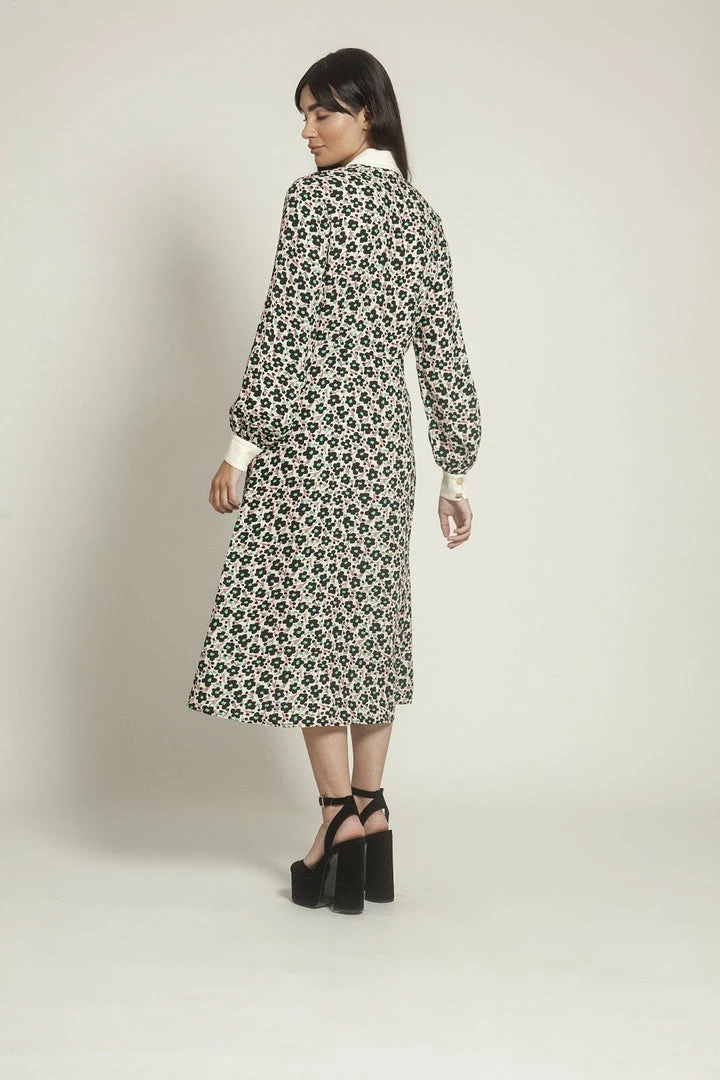 Mercedes is our new from office to pub style. Made in a lightweight crepe and patterned with a retro floral print. It’s buttoned throughout and the puff, dropping sleeves with buttoned cuffs give the style a retro edge. Flattering and slightly flare skirt with 70’s vintage style. Pair with heels or nice boots.Â