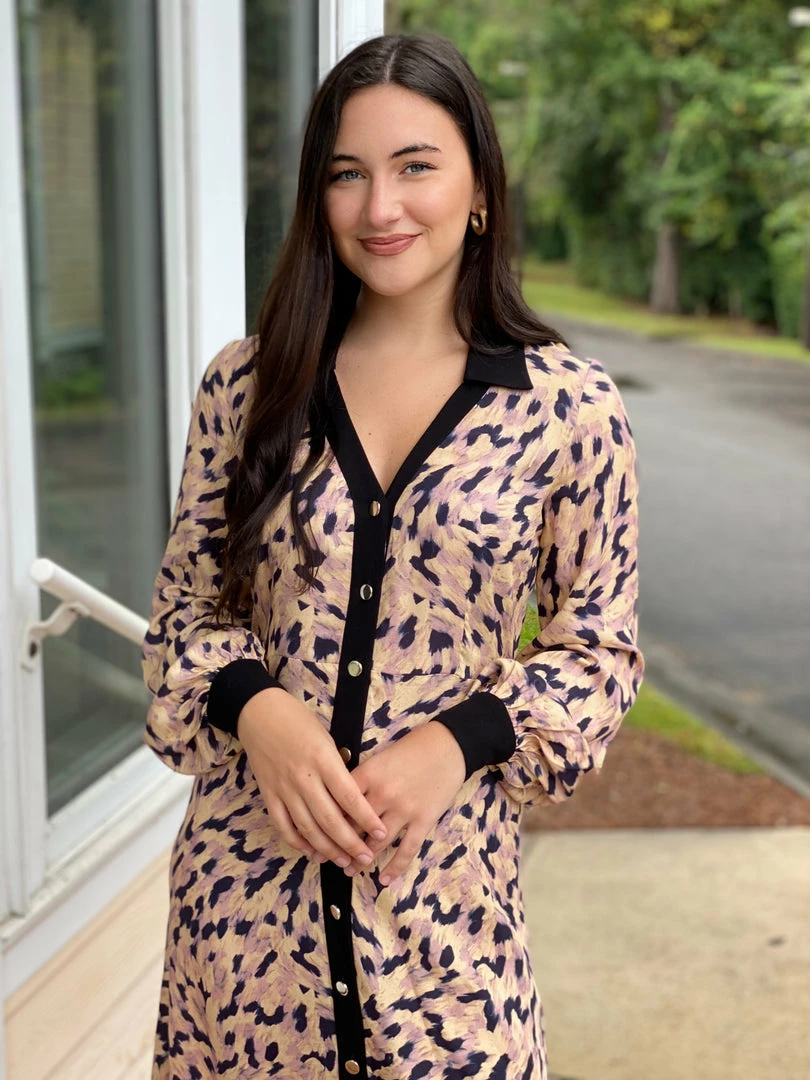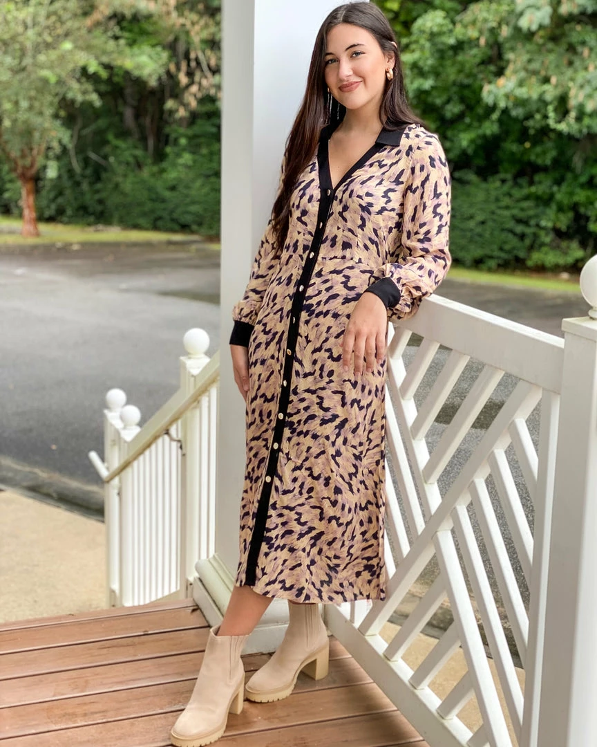 Mercedes is our new from office to pub style. Made in a lightweight crepe and patterned with a retro floral print. It’s buttoned throughout and the puff, dropping sleeves with buttoned cuffs give the style a retro edge. Flattering and slightly flare skirt with 70’s vintage style. Pair with heels or nice boots.