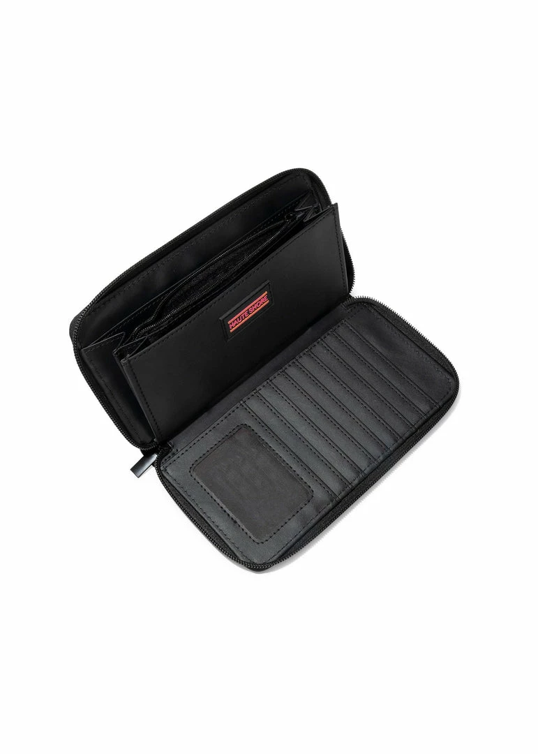 Full size zip around wallet featuring 2 bill slots, 1 zip change slot and 10 card slots.