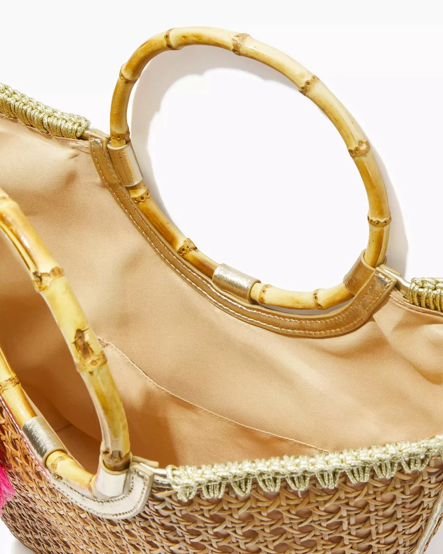 - Natural cane tote with bamboo top handles, gold embroidered whip-stitching trim and colorful hanging thread tassels.