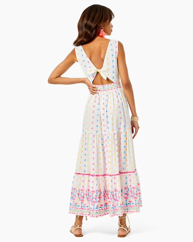- Fit and flare, ankle length maxi dress with v-neckline, tiered skirt with pop-color trim and embroidery, bodice cups and back tie detail.