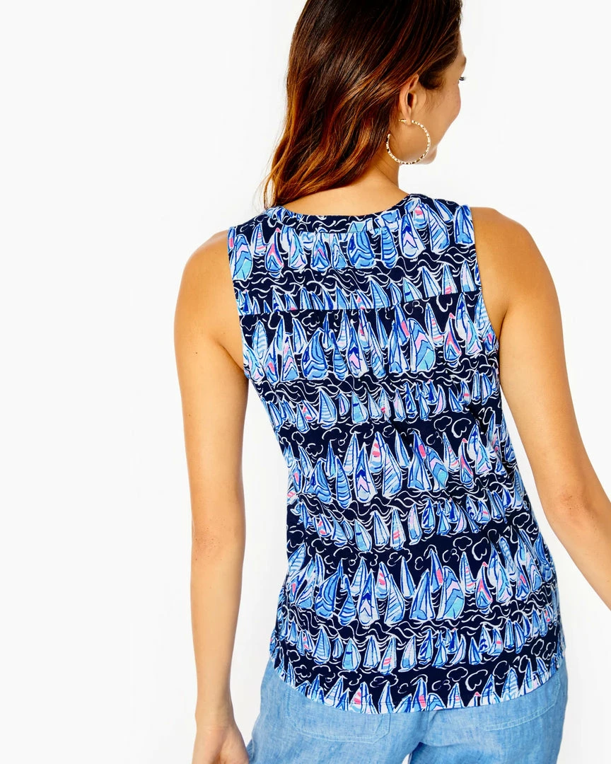 - Easy fit, bra-friendly, sleeveless top with v-neck placket.