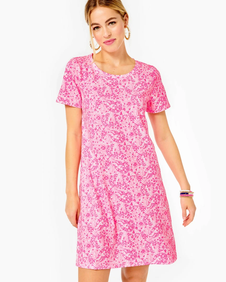 Sunny seasons are all about adventure, and our Cody T-Shirt Dress is ready for the ride–with comfort and style. This t-shirt dress sports a swing fit, crew neckline, and short sleeves. Soft pima cotton jersey and a delightfully bright Lilly print complete the sunny look. Swing into spring in this sweet style.