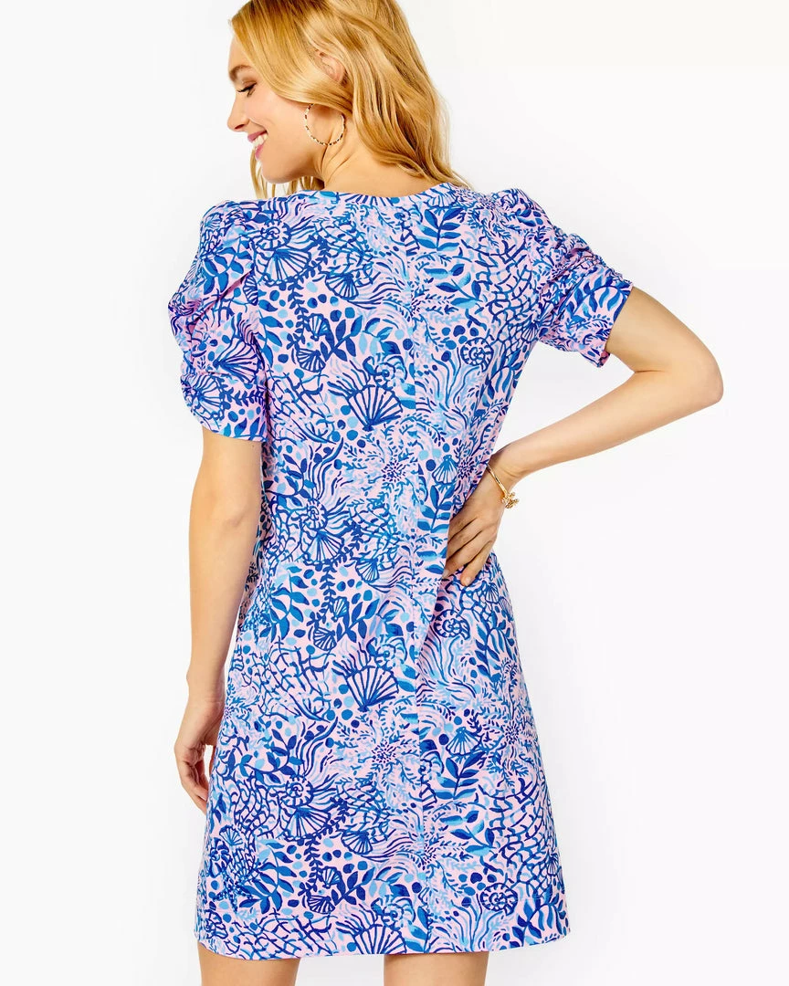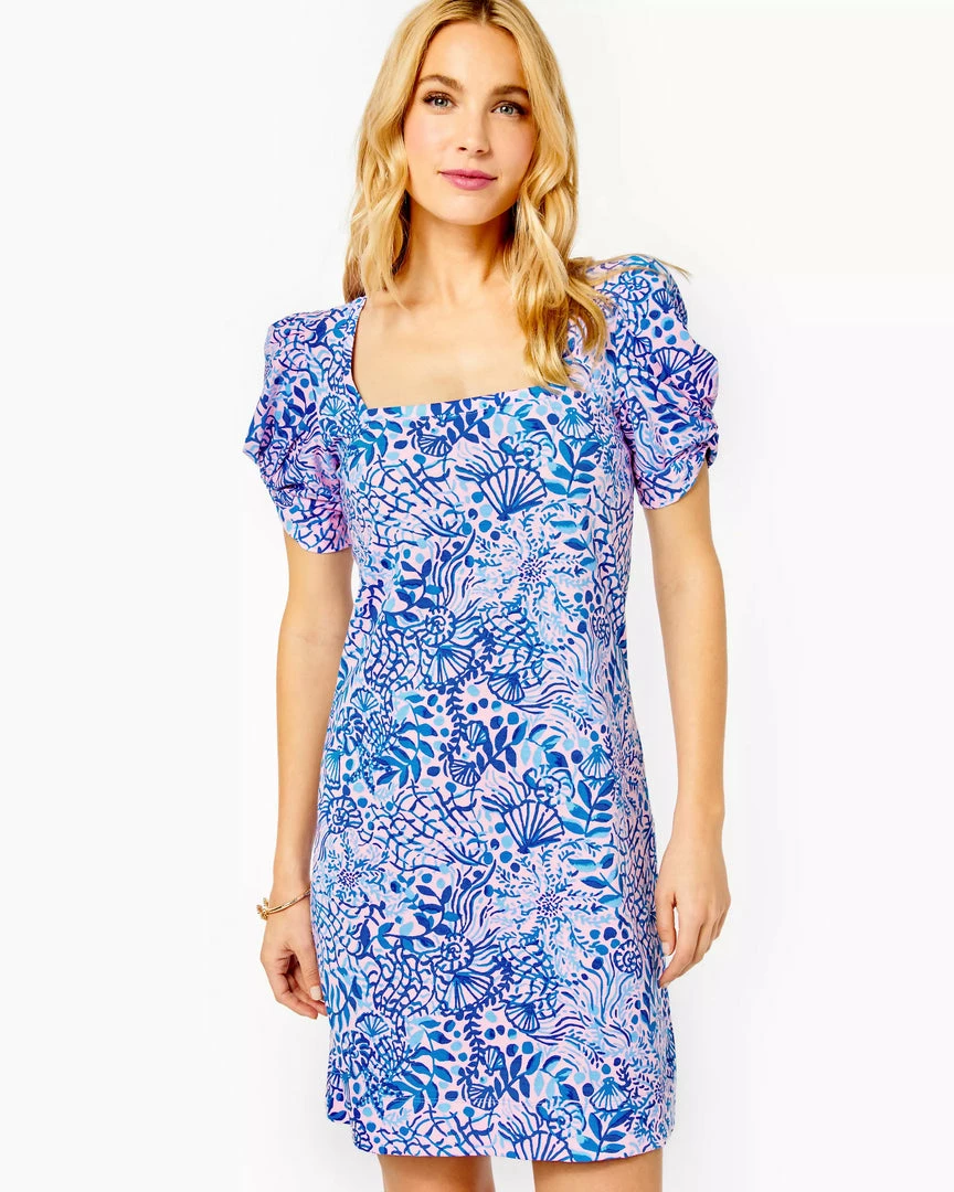 We love this straight fit t-shirt dress for its statement sleeves, which pair a short puff silhouette with a twist detail. This square-neck dress is made from Supima cotton jersey and boasts an on-trend square neckline and short skirt, all wrapped in a vibrant Lilly print.
