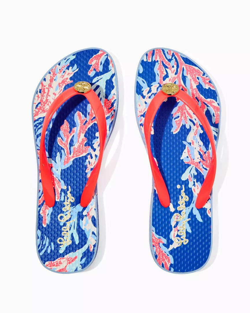 We dressed up this essential poolside flip flop with lots of Lilly details! A vibrant print covers the sole, paired with a solid jelly upper. Match your sandals to your printed swimwear or coordinate with a solid custom color suit.