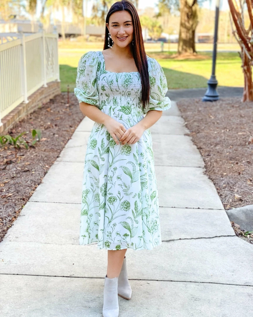 With her flattering square neckline and elbow length puffed sleeves, our new Bridget Midi dress is a modern interpretation of the retro Renaissance style. She has a smocked bodice and cuffs, and flirty gathered midi skirt with side pockets. Shown in our Toile Leaf print.