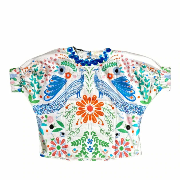 Feminine and beautiful, our Flora blouse is sure to be the focus of any outfit. Gorgeous embellishments frame the neckline. This blouse will spark joy in whoever wears it.Â