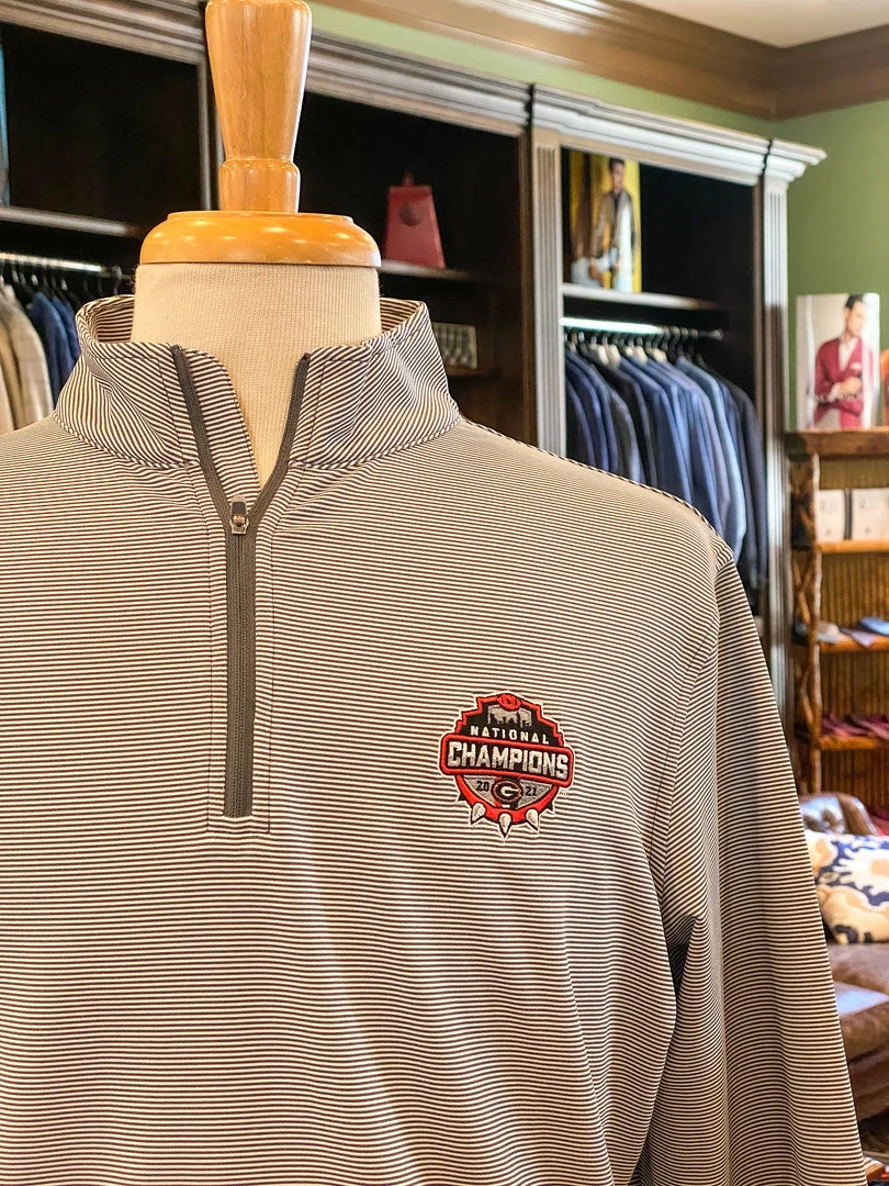 Be the first to review “Peter Millar Outerwear Georgia National Champion Perth Mini-Stripe Stretch Loop Terry Quarter-Zip (Iron/White)” Cancel reply