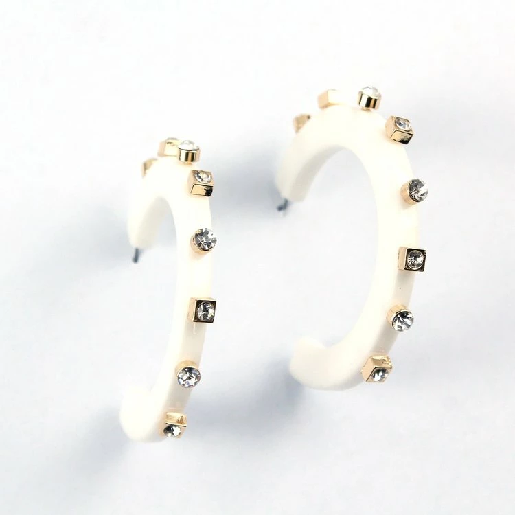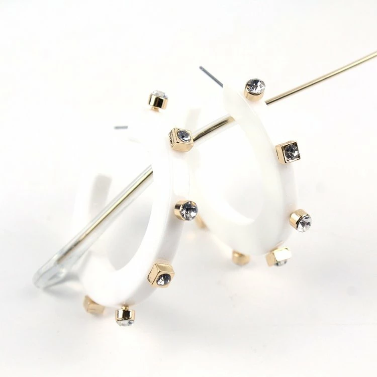 Acrylic thick hoop surged with a steel post, 1 1/4 “ SMALL , 2 “ LARGE . Acrylic rhinestones extend the design for three dimensional look.Light weight, easy to put on and take off, comfortable to wear. Made of eco-friendly, lead-free, nickel-free, and not easy to corrosion.