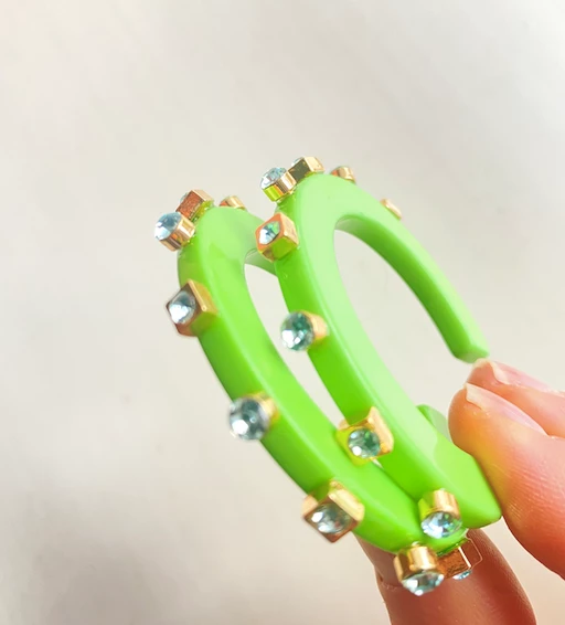 Acrylic thick hoop surged with a steel post, 1 1/4 “ SMALL , 2 “ LARGE . Acrylic rhinestones extend the design for three dimensional look.Light weight, easy to put on and take off, comfortable to wear. Made of eco-friendly, lead-free, nickel-free, and not easy to corrosion.