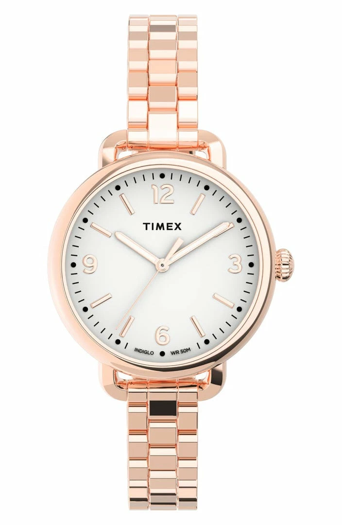 Our petite Timex Standard Demi shines as one of our most refined everyday watches with proportions that reference the best of midcentury watch design including a fluted crown and stirrup lugs. With careful attention to detail, we’ve crafted a versatile timepiece with modern materials for an effortless, unrehearsed sense of confidence on the wrist. This watch is completed with a rose gold-tone case, pearl-white dial and rose gold-tone stainless-steel bracelet.