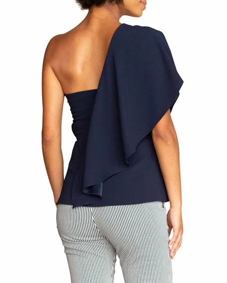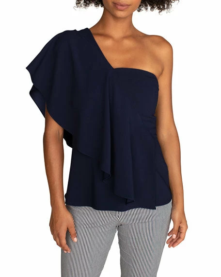 - Trina Turk “Glamorous” solid crepe top with asymmetric flounce drape.