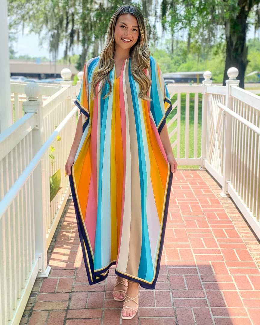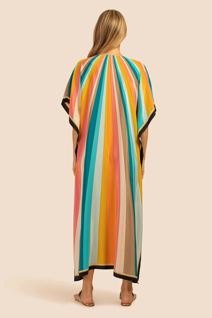 Our top-rated Theodora caftan dress is back in a new print with a burst of sunny color. In luxe silk, this sleek, maxi-dress caftan can be worn on its own, for a romantic dinner under the stars, or as a chic beach cover-up for your next holiday in the sun.